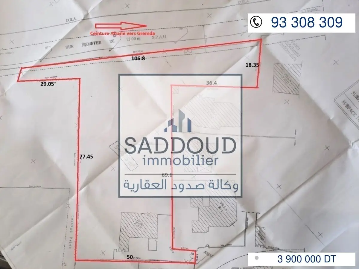 Terrain 4505m² R+2 ceinture l'afrane vers gremda façade de 108m accessible aussi de route afrane et gremda titre arabe